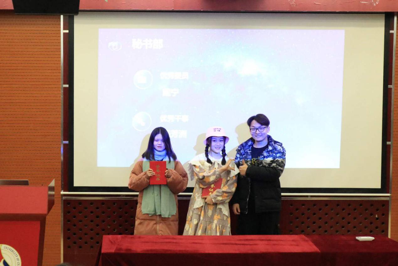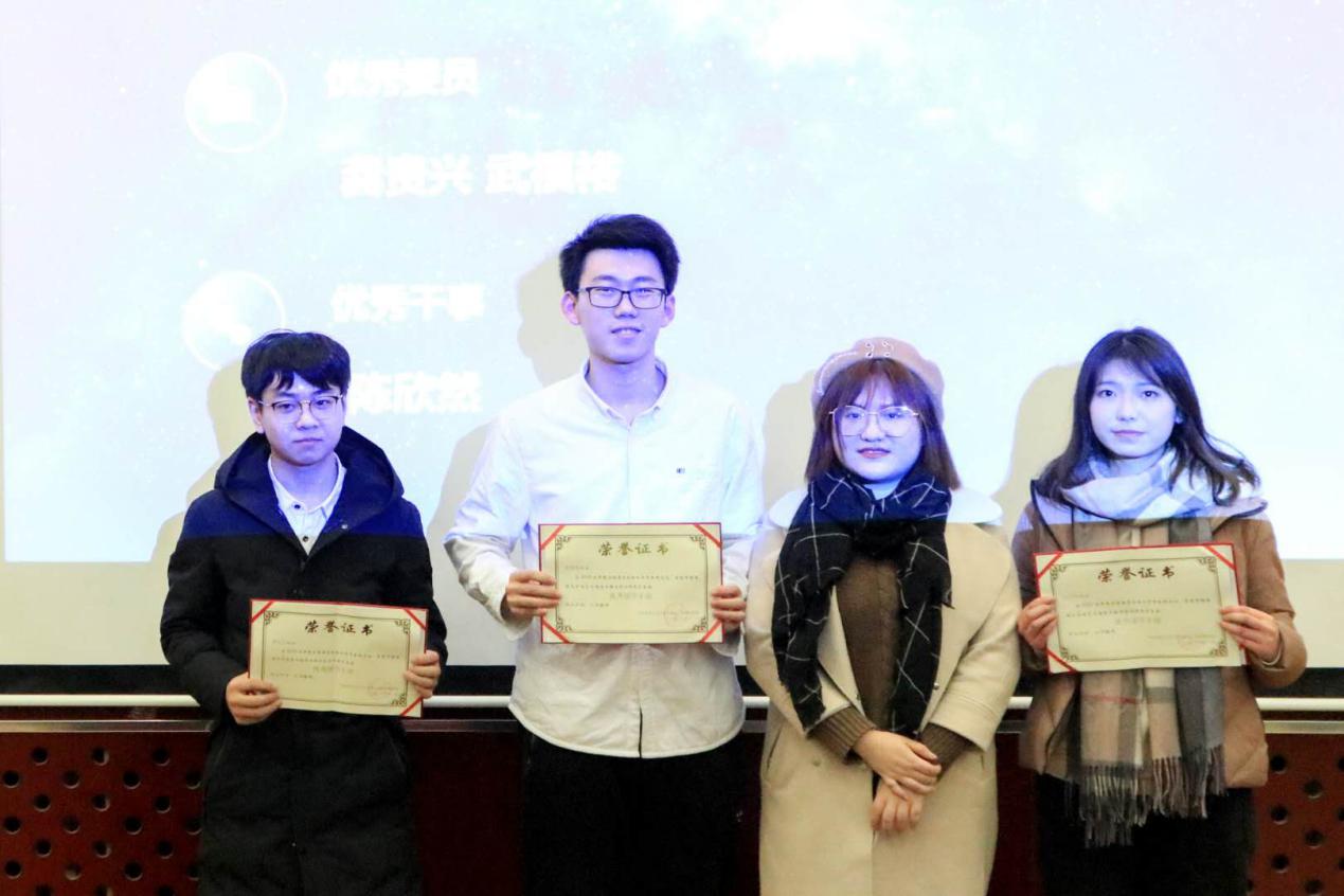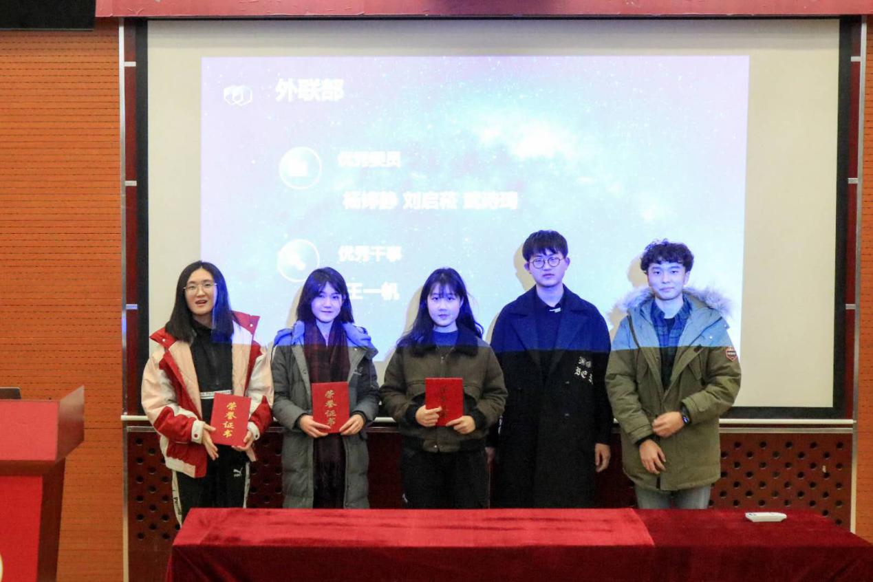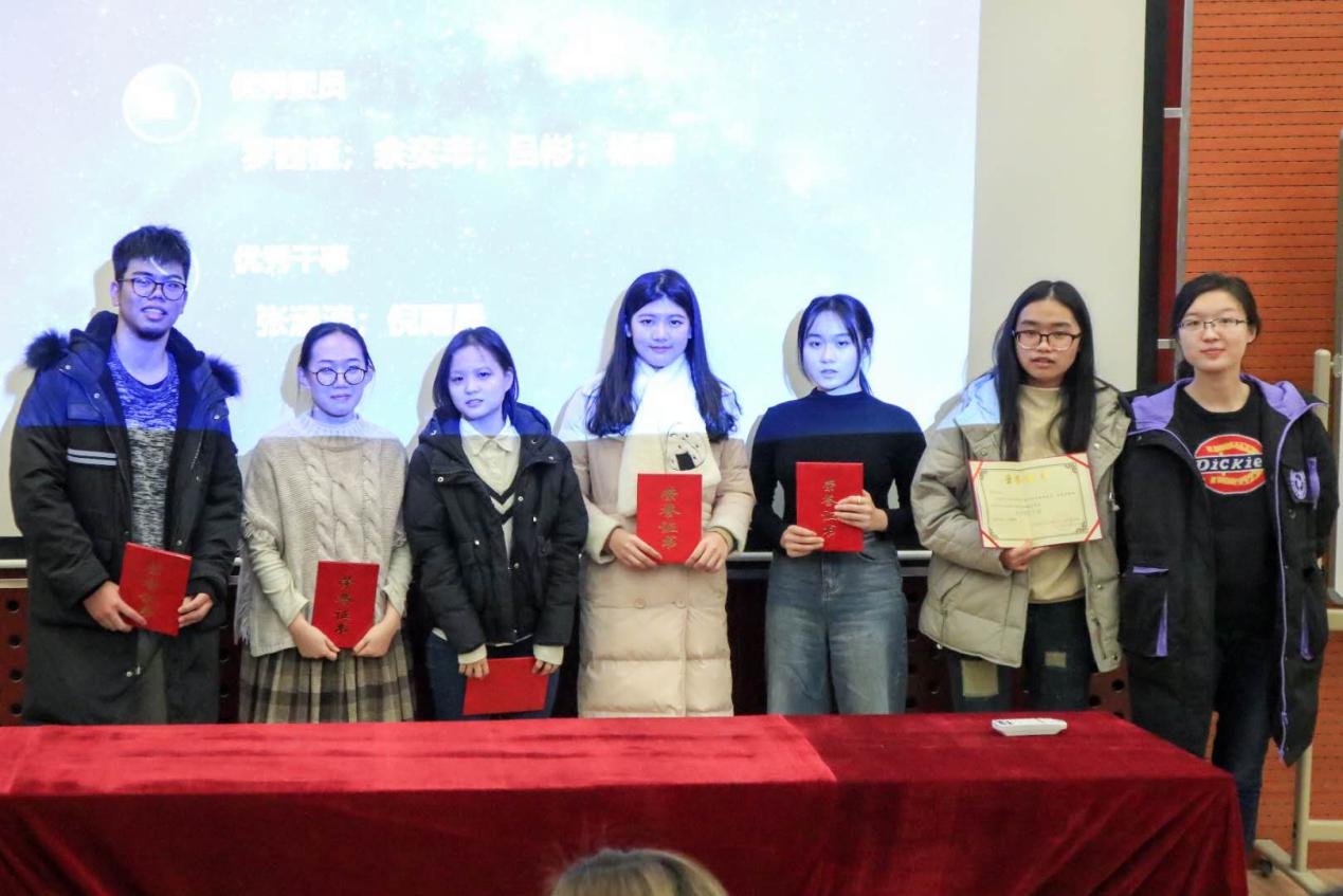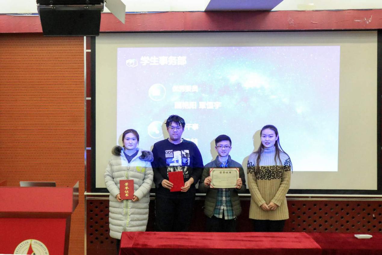 各部门发言结束后,主席胡文睿对这个学期分团委学生会的优秀委员及优秀干事名单进行了宣读。之后各部门部长对其部门获奖人员颁发证书并合影留念。