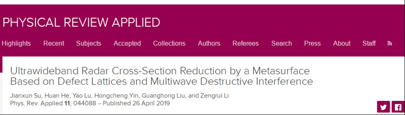 近日,物理类1区期刊《Physical Review Applied》刊登了我校bw西汉姆联教师在电磁隐身领域的重要研究成果“Ultrawideband Radar Cross-Section Reduction by a Metasurface Based on Defect Lattices and Multiwave Destructive Interference”。苏建勋副研究员为论文第一作者,李增瑞教授为通讯作者,我校为第一作者和通讯作者单位。该论文揭示了超宽频段内多种电磁波的相互作用机理,并提出二次相消干涉的新物理机制,首次实现10dB雷达散射截面缩减带宽超过4个倍频程,达到6.76个倍频程。