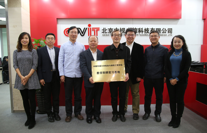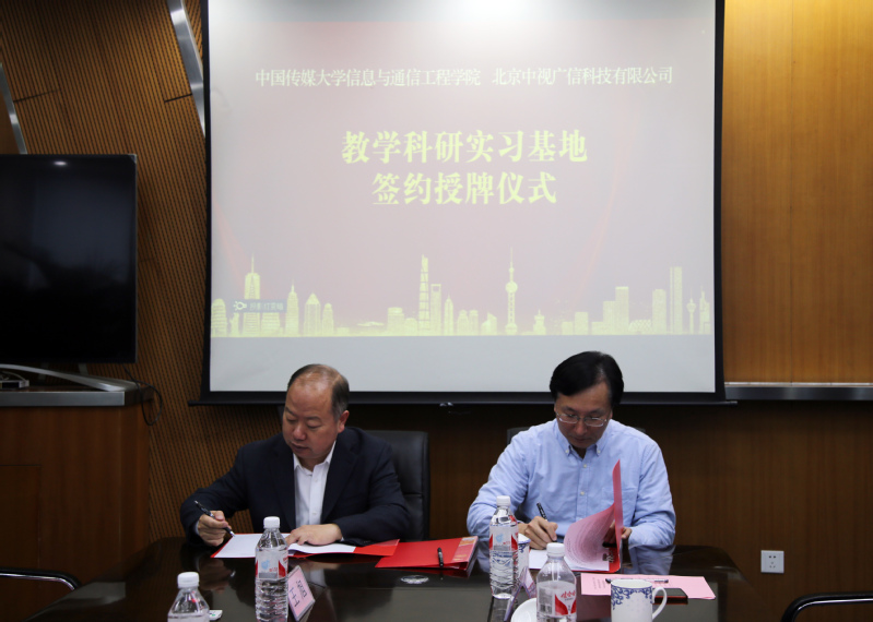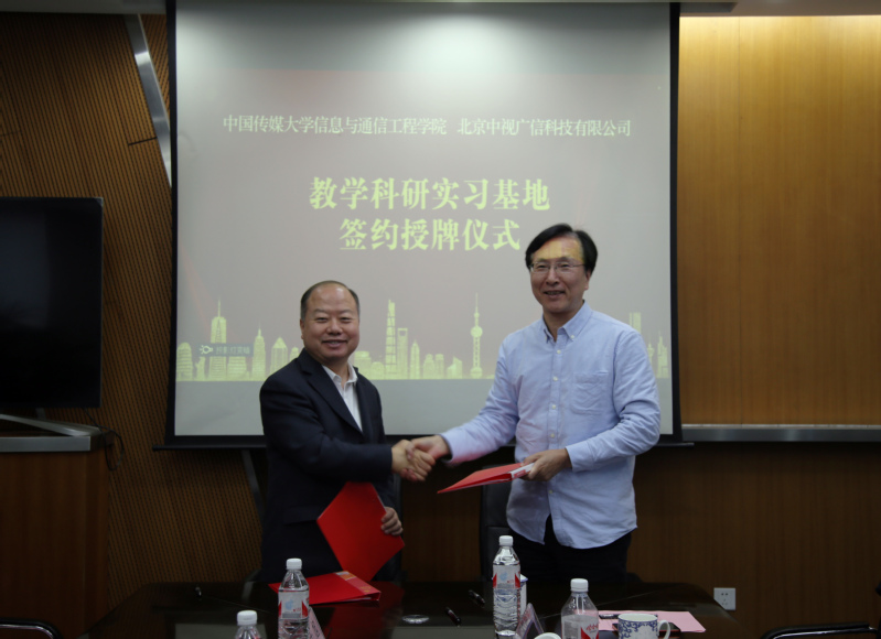 会谈结束后,双方领导进行了实习基地的签约仪式,信通学院院长刘剑波与中视广信总经理徐建新现场签署了合作协议。信通学院党委书记李增瑞进向徐建新总经理行了实习基地的授牌。全体与会代表合影留念。本次实习基地的签约,是对融媒体时代校企合作创新模式的积极探索,旨在通过学校与企业资源、信息深度共享的“双赢”模式,做到应社会所需,与行业接轨,实践与理论相结合,提升人才培养质量与科研水平。