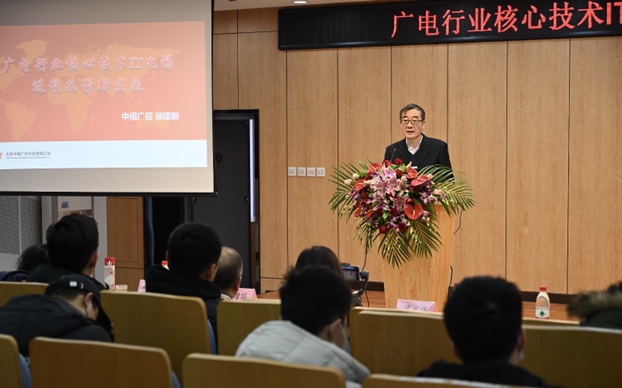 在热烈的掌声中,徐建新总经理进行了题为《广电行业核心技术IT化的进程及最新发展》的主题讲座。徐建新先生结合自身从业经历,以广播电视台传统生产环节为切入点,对广电行业技术发展进行了全面梳理,重点剖析了行业核心技术IT化的发展与变迁。