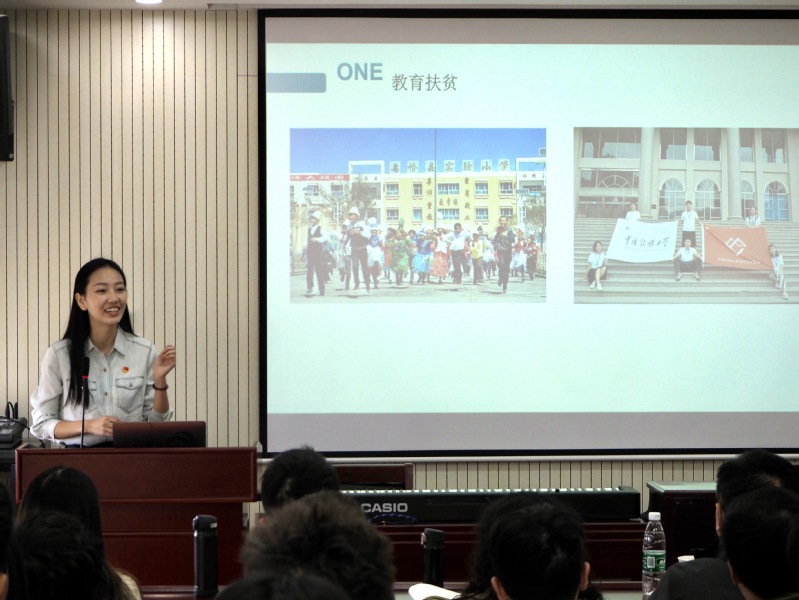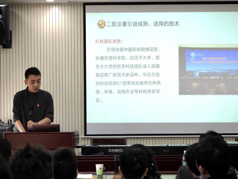信通学院教师党员代表游玉栋和研究生党员代表陈莉娜分别进行了主题为“科技扶贫——助力边疆群众坐上发展快车”和主题为“扶贫先扶‘志’,扶智先扶‘志’”的支教经历分享。主持人李玉杰开展了“辨一辨”分辨贫困地区特色产品的互动环节,在座师生党员积极参与,其乐融融。