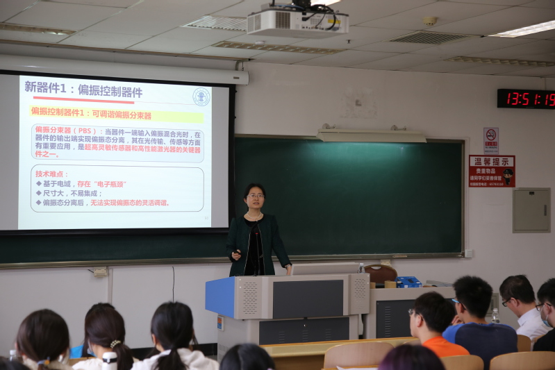 裴丽教授首先介绍了5G的发展与现状,然后提出5G的承载网络为全光网,而5G的新发展对全光网络提出了更高的要求,从而引出本节课的主要内容:强大的全光网络需要新光纤、新器件、新传感、集成化等关键技术的支撑。讲解过程中以她及团队近年来承担的国家重大科研项目为主线重构了教学内容,以服务于国家战略的具体科研实例对关键技术的细节进行了深入分析。裴教授对于基础知识和前沿案例的生动讲授激发了同学们的浓厚兴趣,同学们积极举手与裴老师以问答的方式进行了深入交流。
