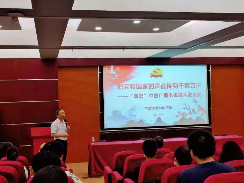 在专题党课中,王晖副校长首先强调了党和国家高度重视广播电视技术发展,党的广播电视事业伴随我党走过了艰辛岁月和光辉历程,把党和国家的声音传到千家万户。随后从新中国广播电视技术发展现状、传输覆盖体系、技术发展亮点三个层面,回顾了我党广播电视事业发展历程,并介绍了我党在广播电视技术领域取得的辉煌成就和其中艰苦奋斗、牢记使命的广电技术人才。王晖副校长从自身专业领域出发,结合工作实际,将党史、校史、传媒史相结合,让与会师生了解到技术创新驱动是广播电视事业发展的关键,产学研协同培养的人才保障是广播电视行业发展的生命线。