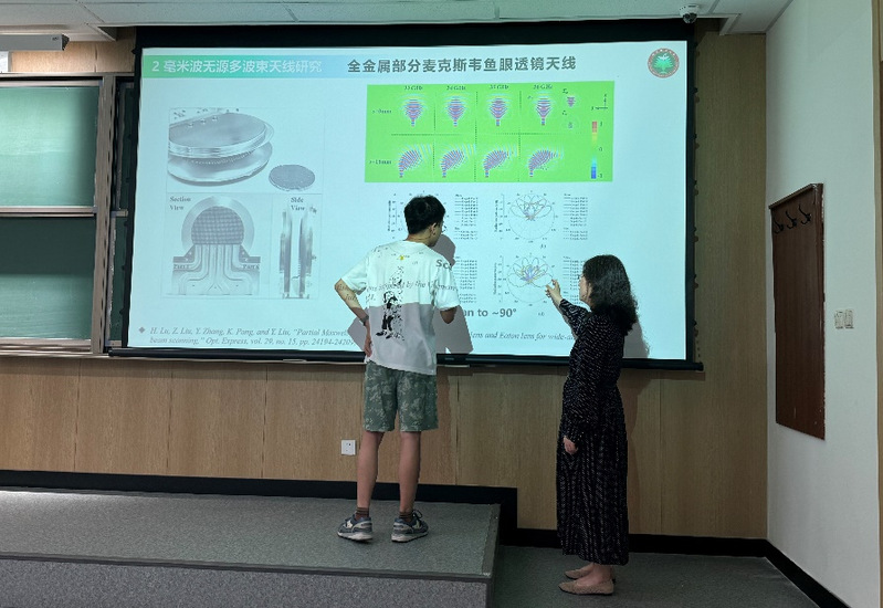 上午,我校2023级博士生李立,北京理工大学2022级博士生聂博宇和我校2022级博士生陈潜分别作了题为《基于无穷小电磁偶极子阵列的天线辐射场计算》、《基于金属媒质的毫米波及太赫兹多波束天线》和《新型频率选择吸波体设计及在天线RCS减缩中的应用》的报告;我校2021级博士生徐程祥和王檬分别作了题为《四极化可重构超表面设计》和《三极化大规模MIMO信道特性测量、分析与建模》的报告;我校2020级博士生李盼作了题为《基于辐射和散射性能一体化的智能超表面技术研究》的报告。各位博士生的报告主题鲜明、内容精彩,参会的专家、学者对他们的报告从创新性、逻辑性和严谨性等多个角度进行了细致的点评和分析,并与同学们展开了热烈的交流和探讨,针对一些关键问题和难点,提出了详细建议与指导。