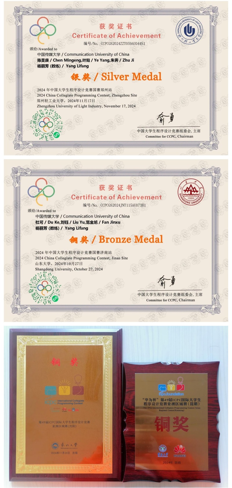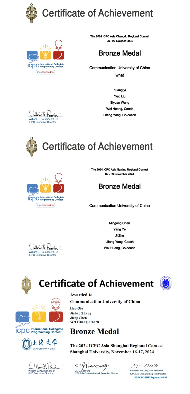 2024年,我校ACM参赛队伍通过省赛、网络赛先后获得CCPC国赛和ICPC亚洲区域赛各赛站的现场赛资格,共获得CCPC国赛银奖1项、铜奖1项,ICPC亚洲区域赛铜奖5项。今年是我校同时在CCPC和ICPC国赛上获奖队伍人数最多的一年,本年度共有5支队伍15人获得奖牌。
