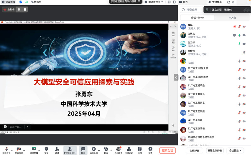 此次前沿课的主题为“大模型安全可信应用探索与实践”。张勇东教授首先介绍了大模型的技术发展史,强调了研究大模型安全的重要性,并从大模型内容安全的研究背景、风险剖析、风险应对等方面进行了详细的介绍。张勇东教授从逻辑可信、事实可信、价值可信三个层面分析大模型面临的安全挑战,并分享了围绕这三个层面开展的大模型安全诊断与修复工作。在讲座最后,张勇东教授结合大模型安全研究的实践经验,提出未来大模型安全可信研究的发展趋势与未来方向。通过这次讲座,在场师生对大模型安全可信应用方面有了更为深刻的理解和认识。讲座结束后,参会师生与张勇东教授进行了深入的交流与讨论。