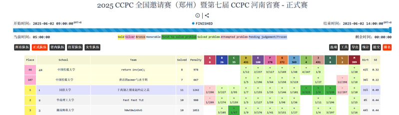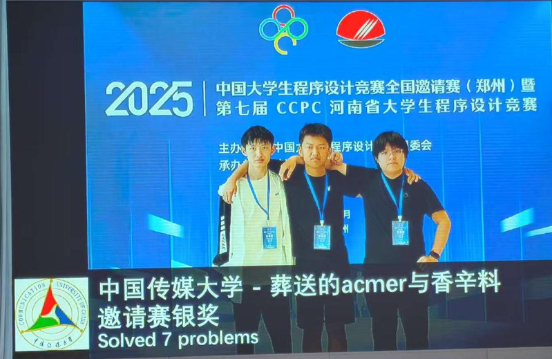 由2023级智能科学与技术专业范金旭、2023级人工智能专业刘钰、2023级电子信息工程专业杜可组成的参赛队伍“return inv(wa);”表现出色,斩获了银牌第二名的好成绩,并且在封榜后过了一道全场只有4支队伍AC的金牌题,充分展现我校学生的算法竞赛实力。